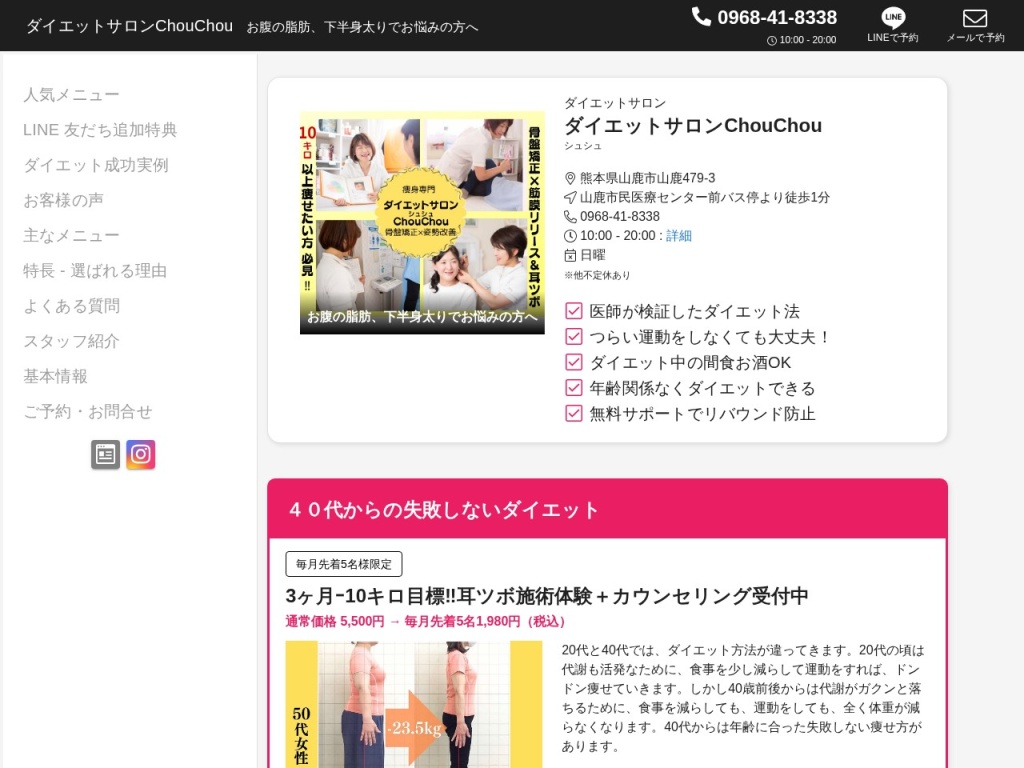 エステサロン ChouChou 山鹿 パーソナライズされたダイエットプログラム提供 食事指導、運動指導、ボディケア 要問合せ